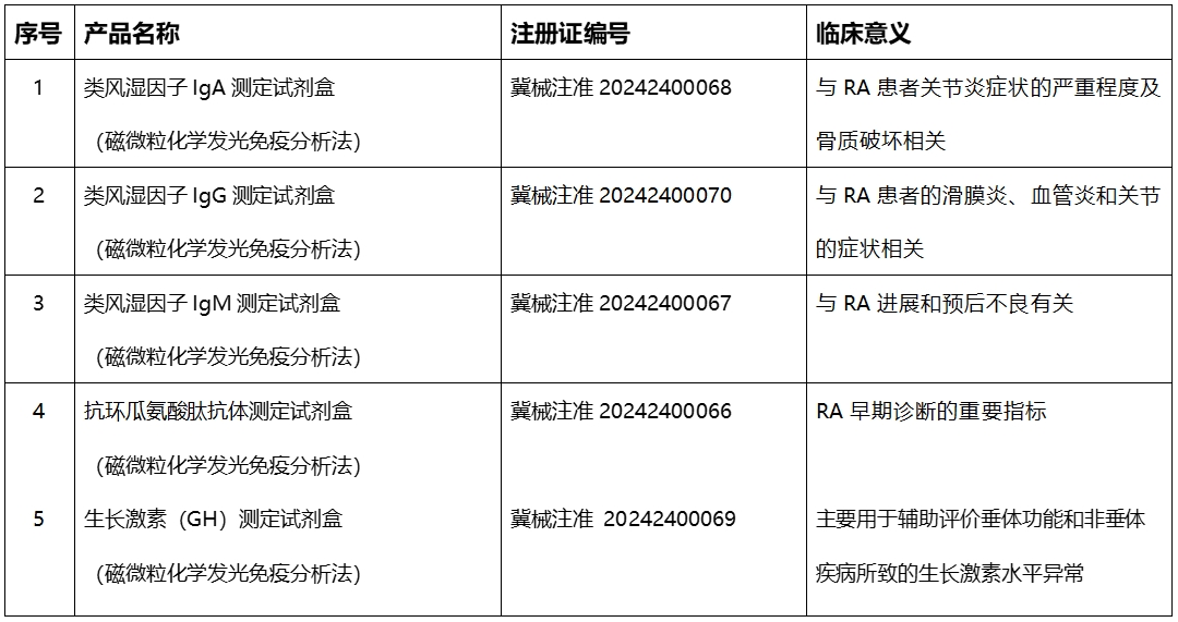 近日,熱景生物新取得由河北省藥品監(jiān)督管理局頒發(fā)的醫(yī)療器械注冊證,分別是類風(fēng)濕因子分型(RF-IgA、RF-IgG、RF-IgM)、CCP抗體、生長激素(GH)、胰島素樣生長因子結(jié)合蛋白-3(IGFBP-3),見下表: