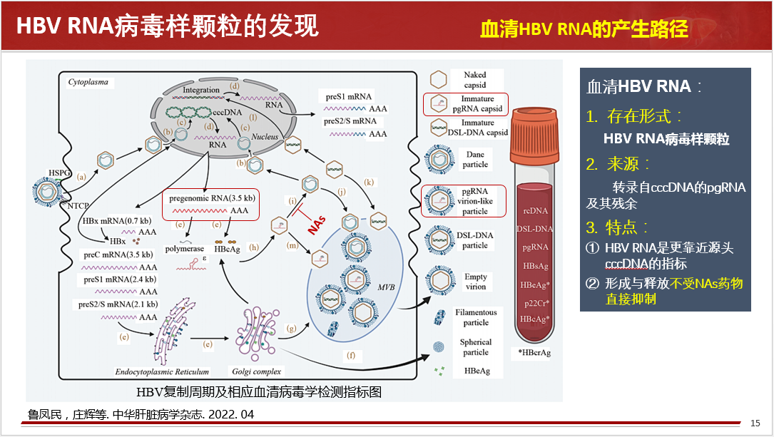 關(guān)于HBV RBA病毒樣顆粒的發(fā)現(xiàn)、血清HBV RNA的產(chǎn)生路徑、存在形式、來源和特點等做了詳細闡述,同時分享國內(nèi)肝病領(lǐng)域張文宏研究團隊等工作成果,血清HBV RNA水平反映肝內(nèi)cccDNA的轉(zhuǎn)錄活性,血清 HBV pgRNA,是NA治療下HBV DNA < LLOQ后,能夠反映患者肝組織內(nèi)是否有cccDNA活躍轉(zhuǎn)錄的唯一指標。
