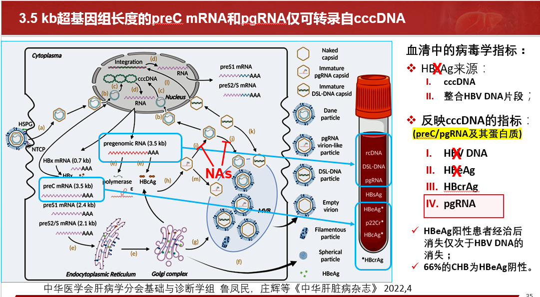 當前常用的病毒學指標HBsAg的來源除了cccDNA以外還有整合HBV DNA片段,只有3.5kb超基因組長度的preC mRNA和pgRNA僅可轉(zhuǎn)錄自cccDNA,因而能反映cccDNA的指標為pgRNA和HBcrAg。
