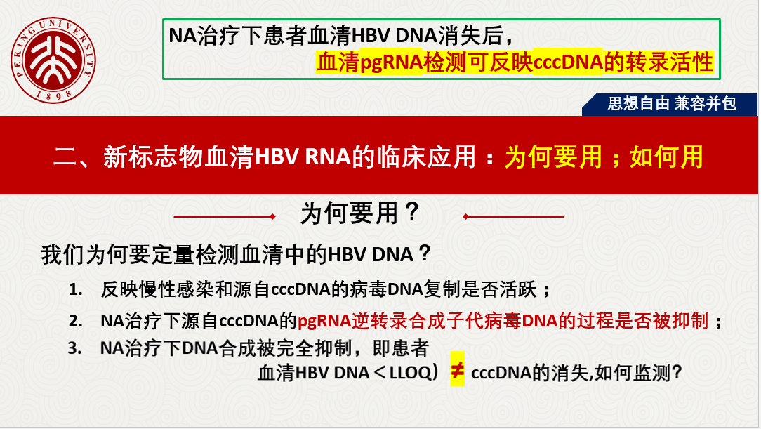 我們?yōu)楹我繖z測血清中的HBV DNA?反映慢性感染和源自cccDNA的病毒DNA復制是否活躍;NA治療下源自cccDNA的pgRNA逆轉(zhuǎn)錄合成子代病毒DNA的過程是否被抑制;NA治療下DNA合成被完全抑制,即患者血清HBV DNA<LLOQ,但不等于cccDNA的消失,如何監(jiān)測?