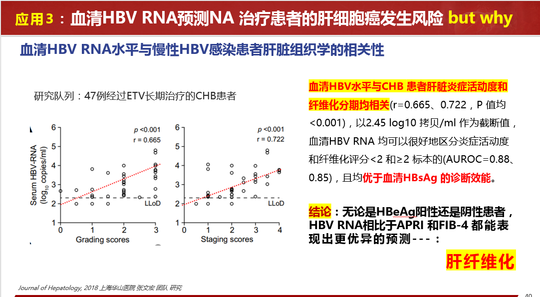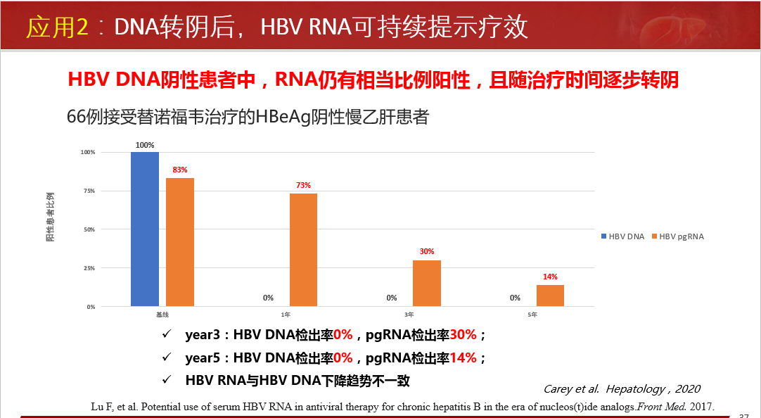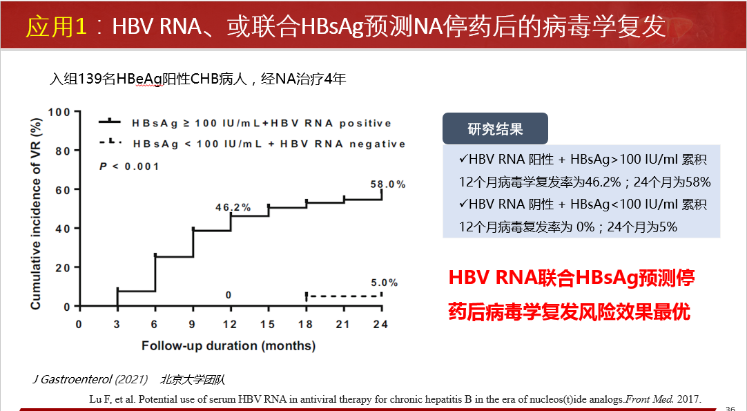 臨床應用方面:指導安全停藥;NA治療下患者血清HBV RNA檢測陽性預示更高的HCC發(fā)生風險;NA治療下患者血清HBV RNA檢測陽性,提示病毒cccDNA仍在有效轉(zhuǎn)錄表達病毒蛋白、組裝子代病毒顆粒樣pgRNA病毒顆粒。