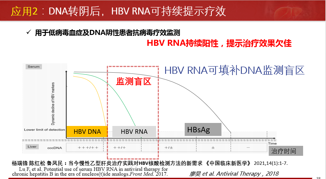 ★ 用于低病毒血癥及DNA陰性患者抗病毒療效監(jiān)測;HBV RNA可填補HBV DNA監(jiān)測盲區(qū),HBV DNA轉(zhuǎn)陰后可持續(xù)提示療效,HBV RNA持續(xù)陽性,提示治療效果欠佳。