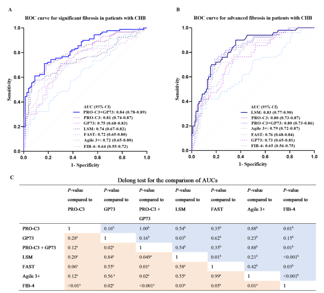 本研究旨在以肝臟組織學為金標準,評估PRO-C3、GP73及二者聯合與其他無創(chuàng)檢測方法(NITs)(FIB-4、Agile 3+、FAST和LSM)診斷CHB患者顯著纖維化和進展期纖維化的效能。